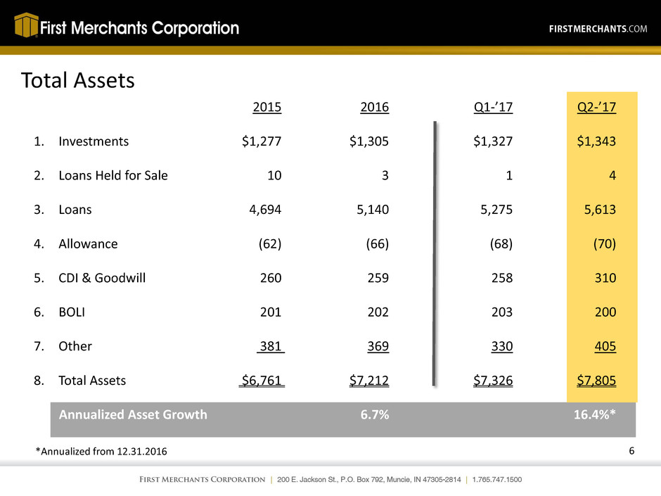 Total Assets of $7.8 Billion Grew by 13.0% over 2Q2016